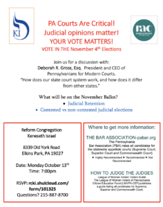 Join us for a discussion on Monday, October 13th at 7pm with: Deborah R. Gross, Esq. President and CEO of Pennsylvanians for Modern Courts. “How does our state court system work, and how does it differ from other states.”
